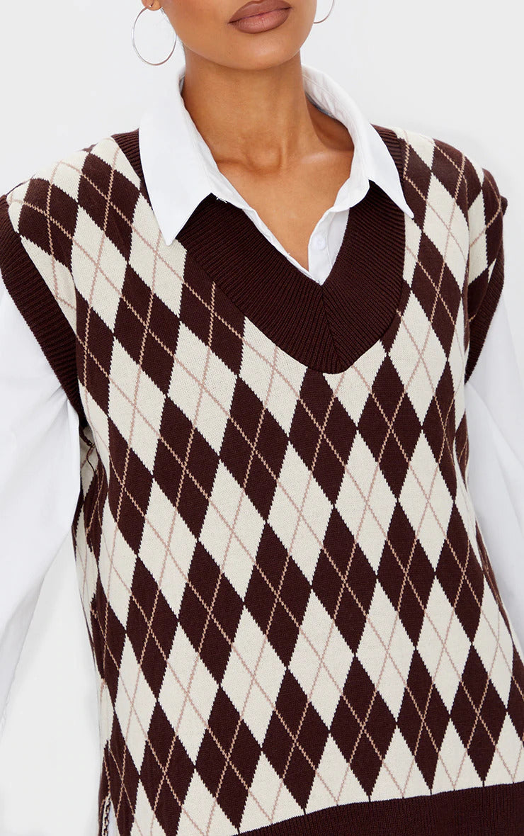 Chocolate Argyle Check V Neck Knitted Side Split Vest