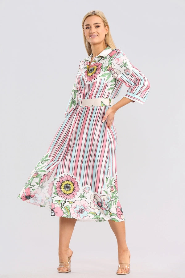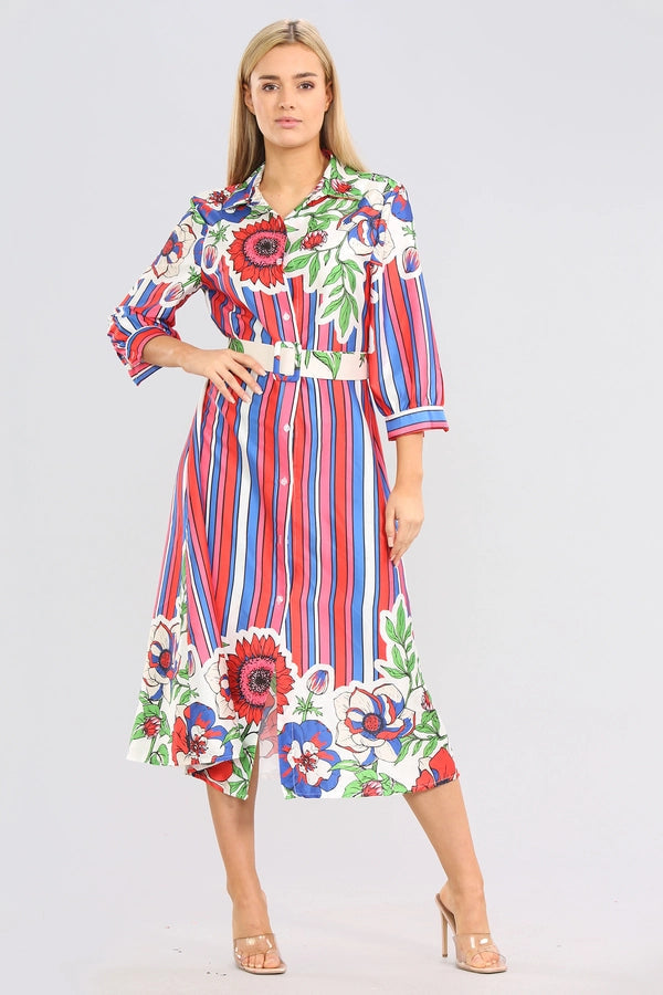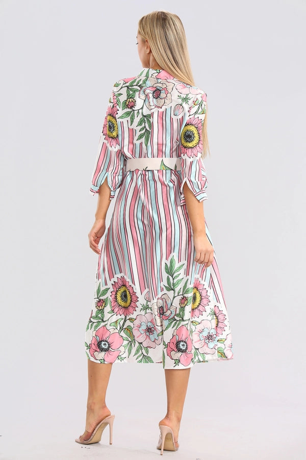 Floral Striped Midaxi Belted Dress: