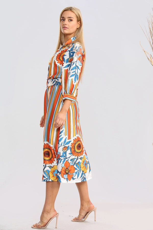Orange Floral Striped Midaxi Belted Dress