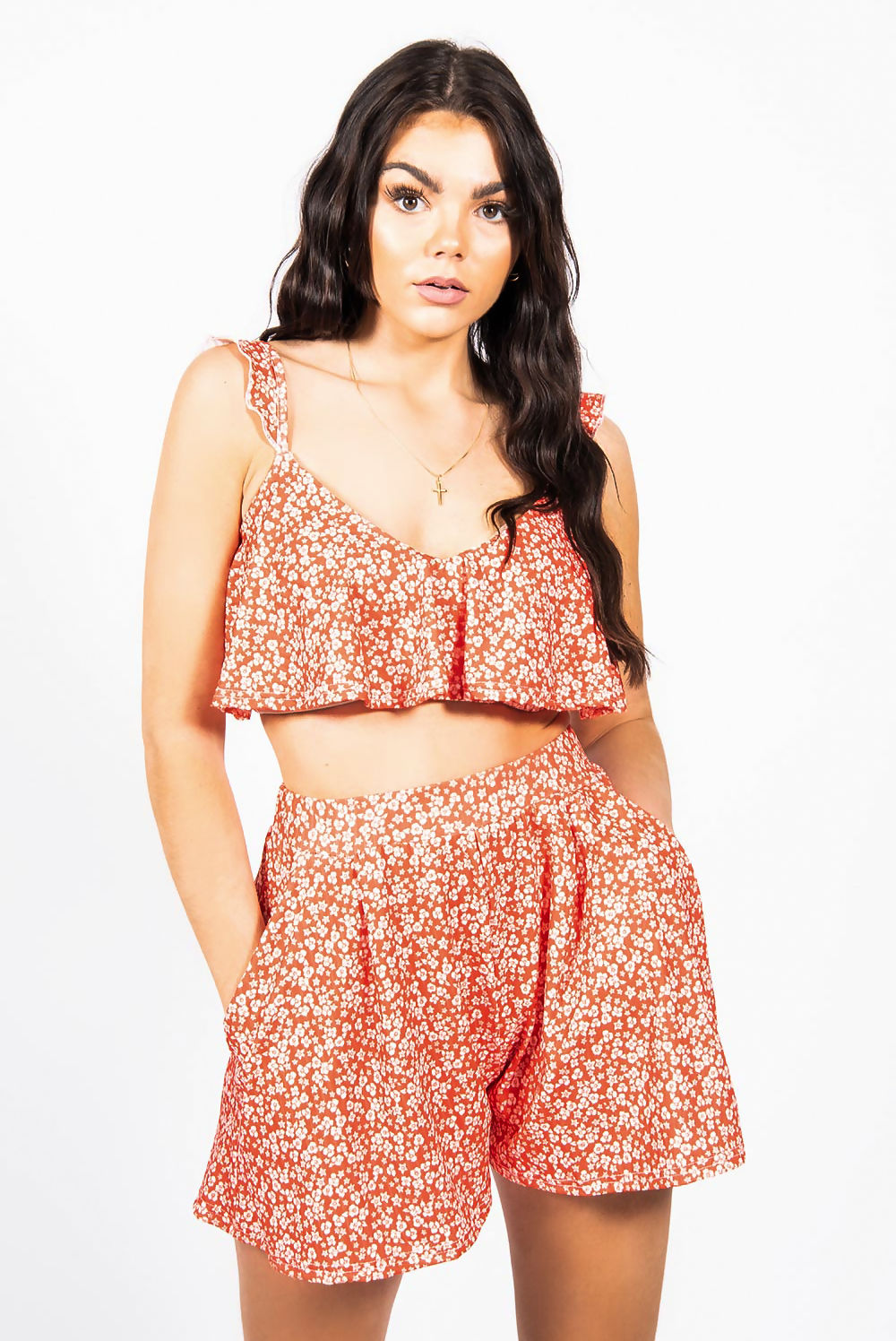 Red Printed Crop Top And Flippy Shorts Set