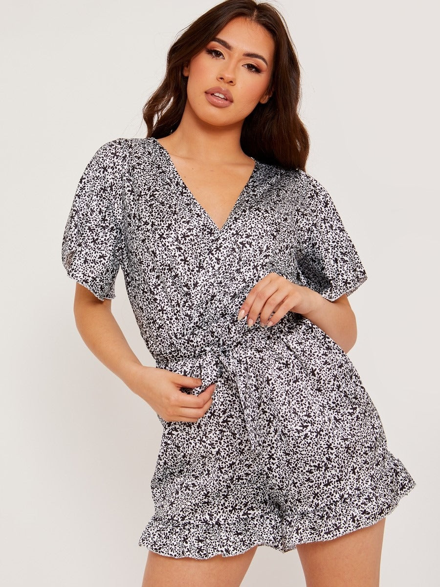 Wrap Front Belted Satin Printed Playsuit